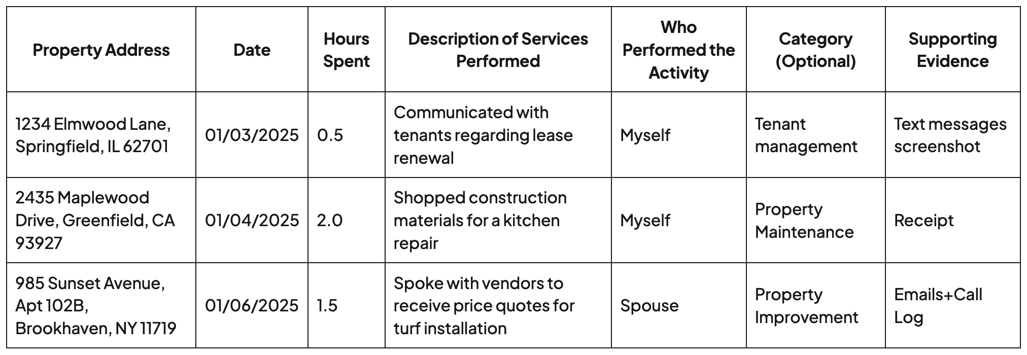 If anyone else works on your properties — spouse, cleaner, property manager, handyman, co-host — log their hours too. This is critical for the 100-hour / no-one-more test and also demonstrates thoroughness to an auditor.